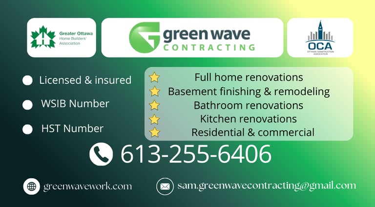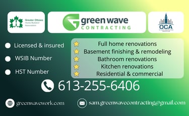 At Green Wave Contracting, we specialize in creating beautiful, functional, and lasting renovations for homes and businesses across Ottawa. Whether you’re upgrading your kitchen, modernizing your bathroom, finishing a basement, or planning a complete home transformation, our experienced team is here to bring your vision to life.